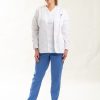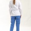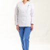 Delantal con escote en «V» curvado, manga larga con pinza de puño y cruce abotonado, 65% poliéster – 35% algodón.