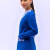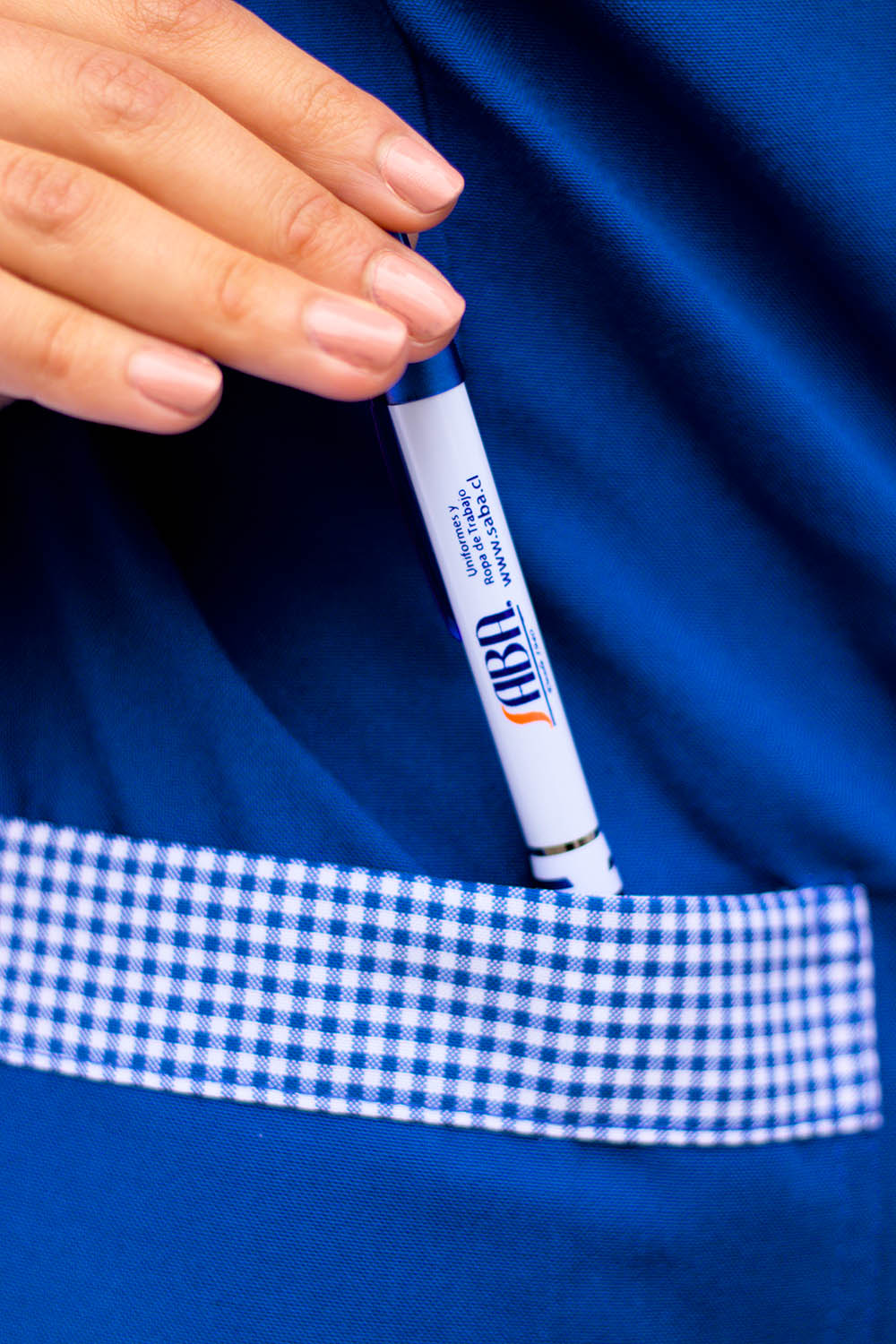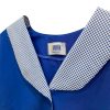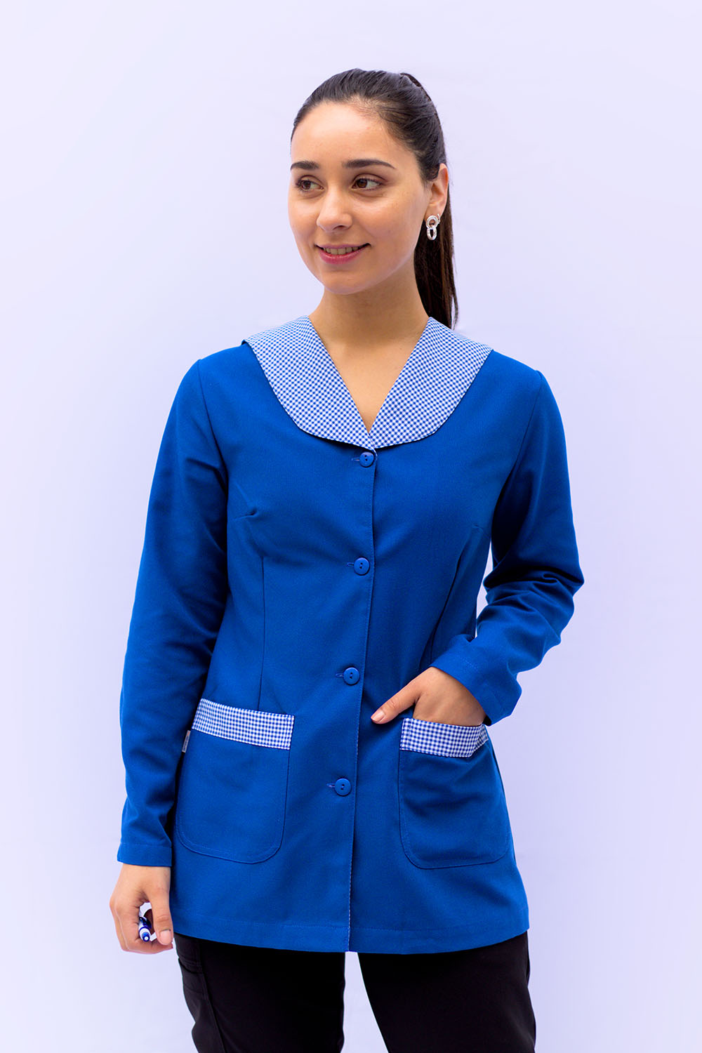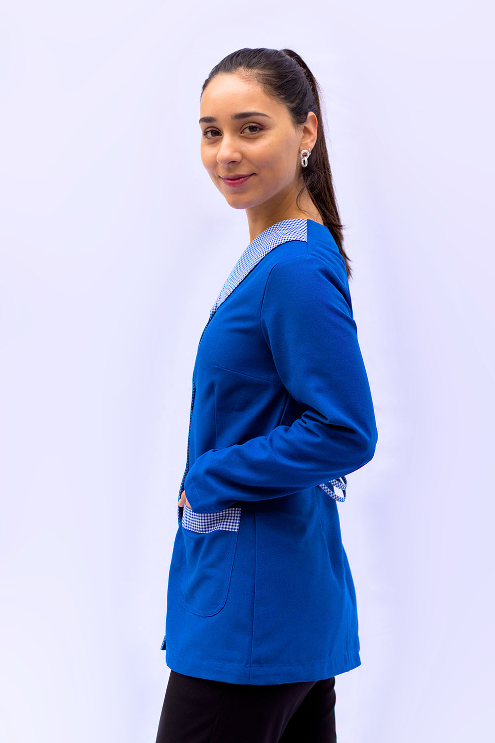 Chaqueta educadora, abotonada y cuello en aplicación, espalda con cinturón y abertura central en basta para mejor calce, manga larga con pinzas en puño y corte princesa.